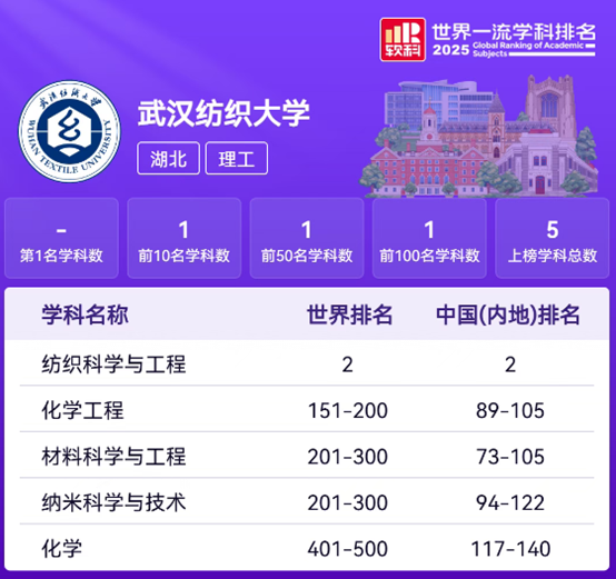 20251118日,高等教育评价专业机构软科正式发布“2025软科世界一流学科排名”。在此次排名中,我校共有5个学科入围榜单,表现亮眼。其中,纺织科学与工程学科排名较去年上升,位列世界第2;化学工程、材料科学与工程、纳米科学与技术等学科排名亦较去年实现进一步提升;化学学科今年首次上榜。